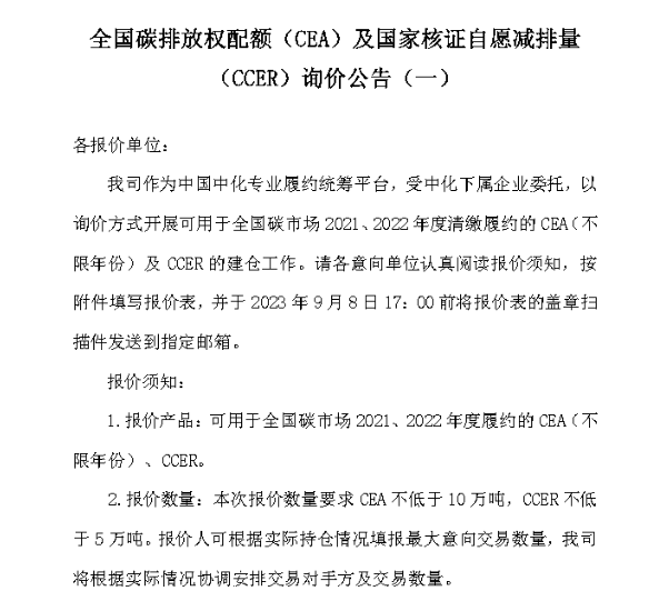 全國碳配額(CEA)及CCER詢價公告